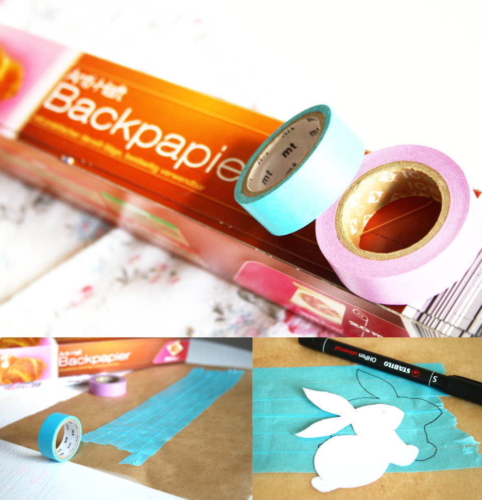 Du klebst einfach einige Streifen Tape knapp überlappend auf das Backpapier, überträgst das Motiv auf die Washi-Streifen, schneidest es aus und klebst es auf.